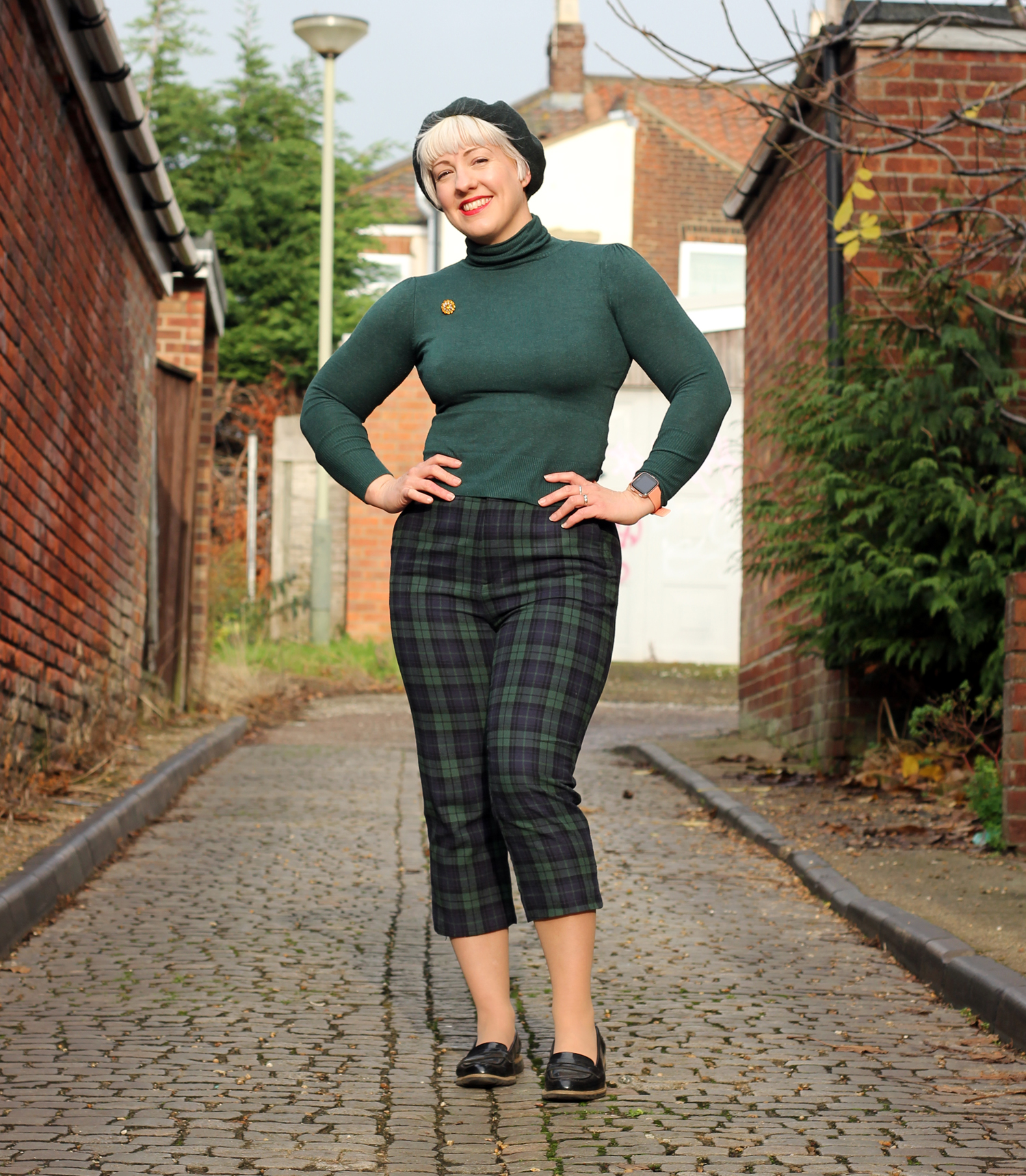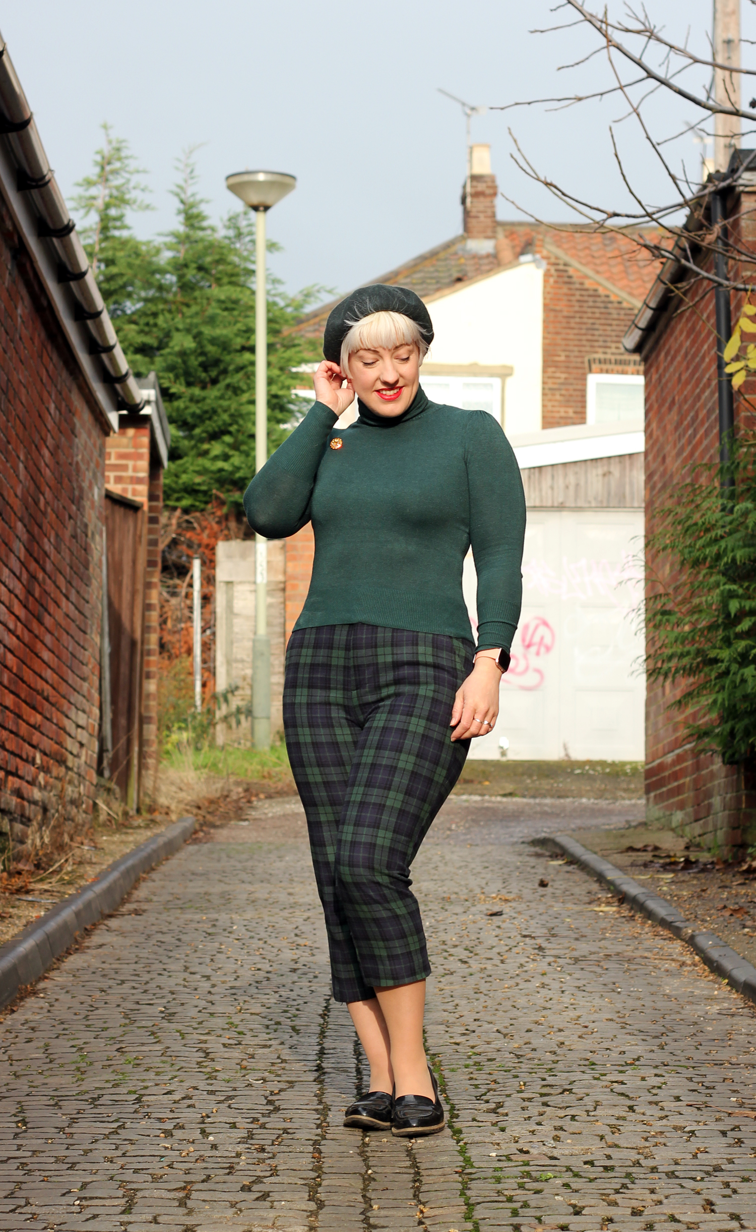 These are the tartan trousers I bought back in October. I hacked about 12 inches off the bottom, and still need to take them up properly, but they’re a dream match for a very old green roll neck and my green beret.
