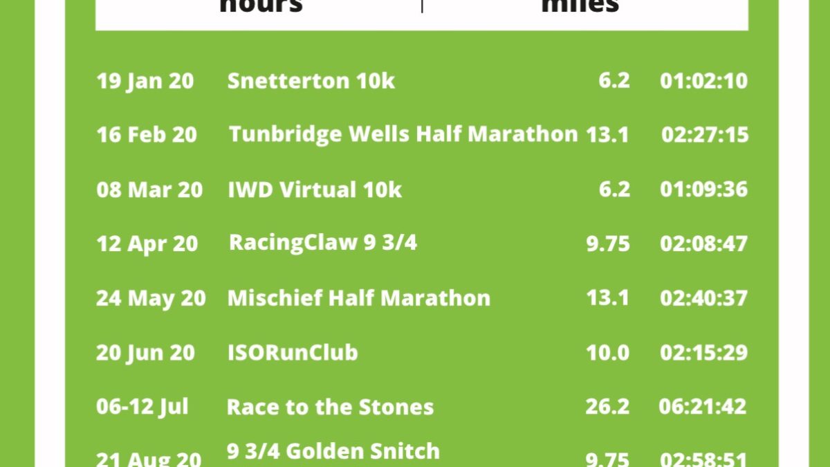 Well, we know what happened there, my last “proper” race was the Half Marathon during storm Dennis in February. But I cracked on with virtual challenges, even when it was so hot I couldn’t bear running and I injured my back.